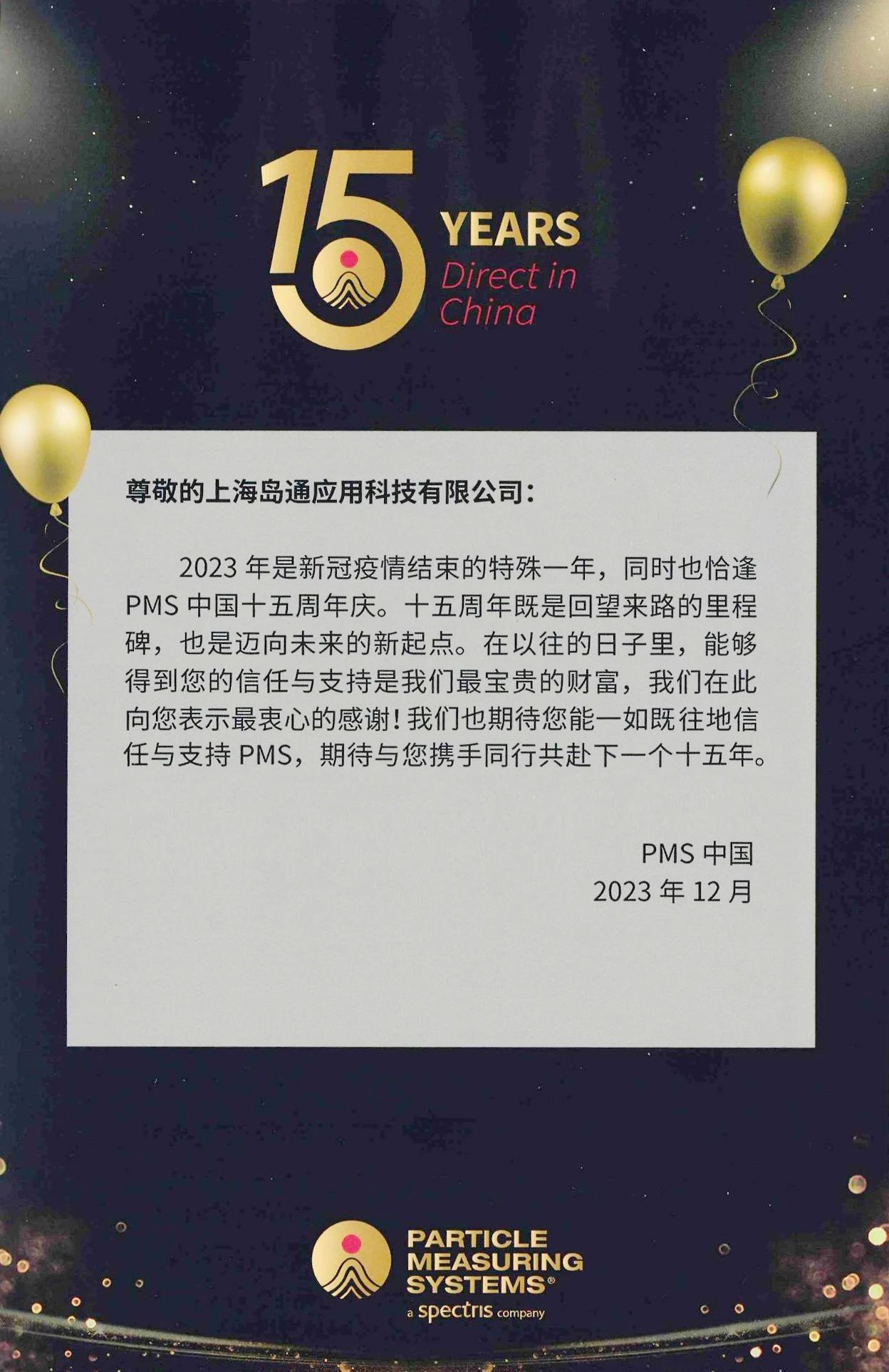 PMS中國(guó)十五周年慶的一封信