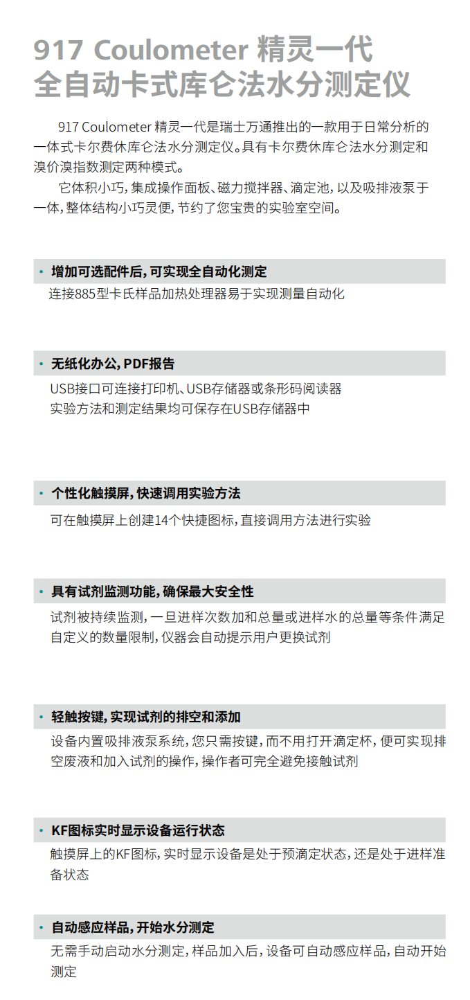 ??????? 905/907系列是瑞士萬通2009年新推出的基于愛?智能TM技術(shù)的全自動電位滴定儀,儀器的智能化技術(shù)在滴定儀中達(dá)到了一個新的高度。主機(jī)、電纜、電極等重要部件均內(nèi)置芯片和數(shù)據(jù)傳輸系統(tǒng),是組建智能化實(shí)驗(yàn)室的不二選擇。